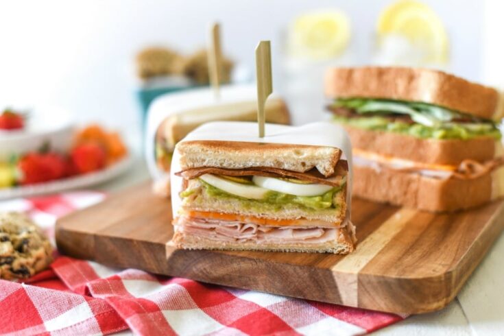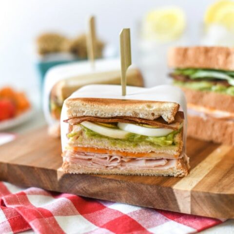 Lightly toast your bread slices (they hold up better than untoasted bread). Begin your stacks by placing 3 slices of toasted bread onto the counter. Add the turkey and cheese to one slice of bread. Top with the 2nd piece of bread. Place the egg slices on top. Spread the avocado mixture on the bottom of the remaining bread and place on top of the eggs. Slice the sandwich in half and wrap with parchment paper for easy handling and presentation.